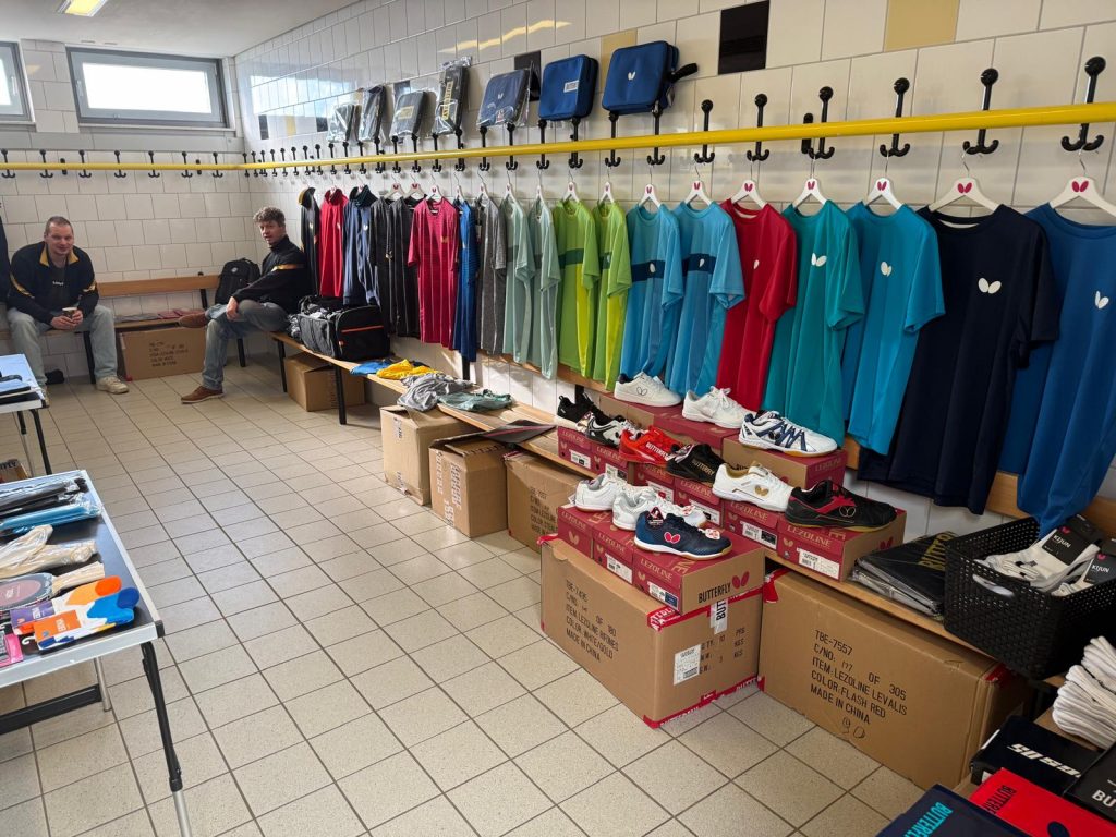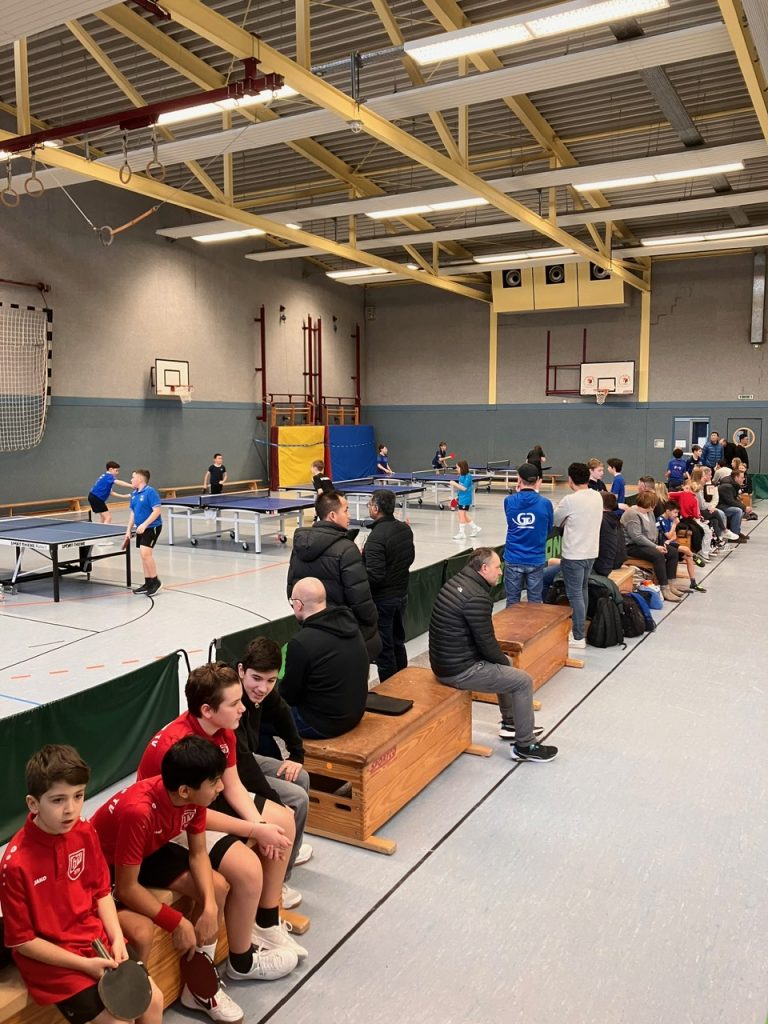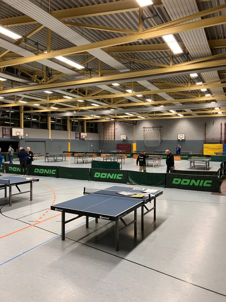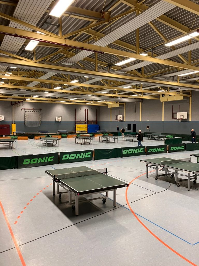Ohne lange zu überlegen erfolgte die Anfrage bei der Gemeinde Hille, die unter Einhaltung einiger Auflagen grünes Lichte für das sportliche Großevent gab. Neben den vereinseigenen Platten wurden kurzerhand vier weitere Tischtennisplatten sowie diverse Tische und Bierzeltgarnituren (vielen Dank an den SC Hille!) organisiert. Der Aufbau ging dann mit vielen Helferinnen und Helfern am Freitag den 13.02.2026 um 19.45 Uhr los. Nach ca. 1,5 Stunden war die Halle 2 in einen tribünenfreien Turnierort umgestaltet, der als solcher seinesgleichen sucht. Nicht nur 18 Platten sollten sich am kommenden Morgen ab 09.30 Uhr den aus ganz Ostwestfalen angereisten Nachwuchsspielerinnen und -spielern präsentieren, sondern eine gemütliche Sporthalle mit Sitzgelegenheiten an jeder Ecke, sowie ein vielfältiges Angebot an Speisen und Getränken.