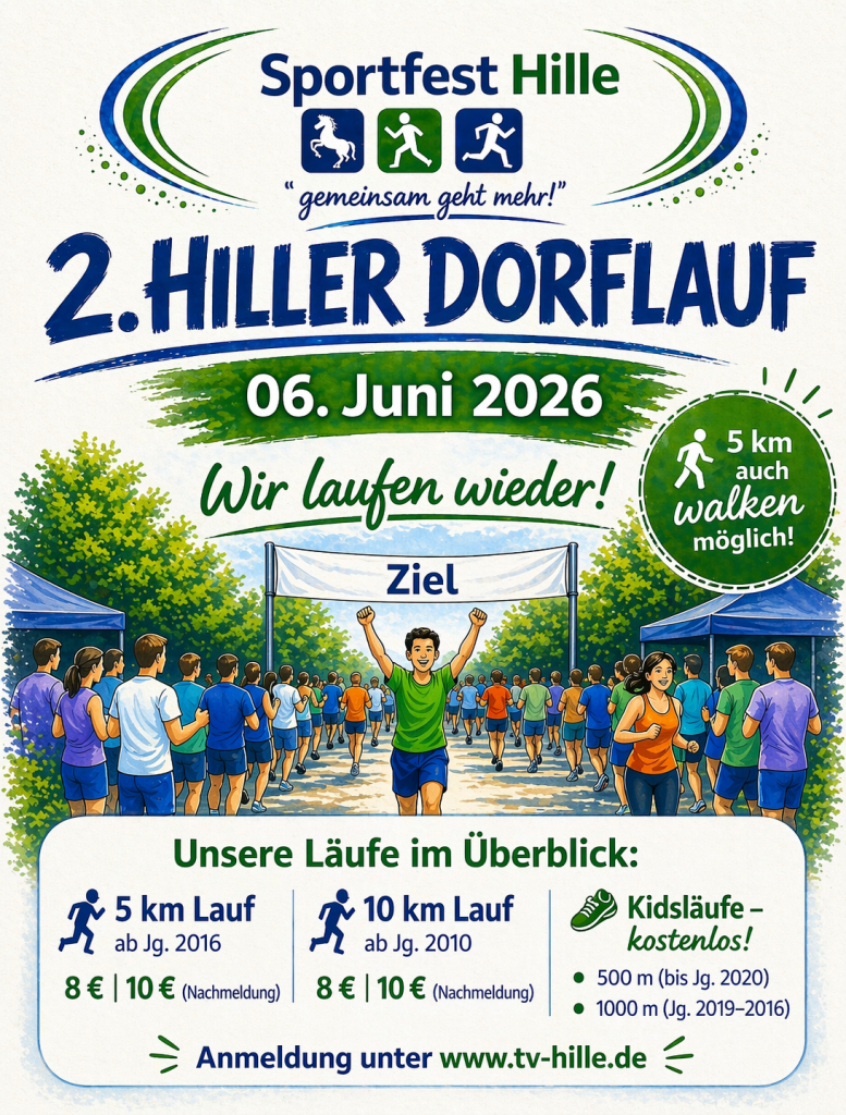 Laufspaß für die ganze Familie – beim 2. Hiller Dorflauf am 06. Juni 2026! Ob 5 km, 10 km, Walking oder Kidslauf – beim Laufevent für Jung und Alt ist für alle etwas dabei. Gemeinsam aktiv sein und Bewegung genießen steht im Mittelpunkt.